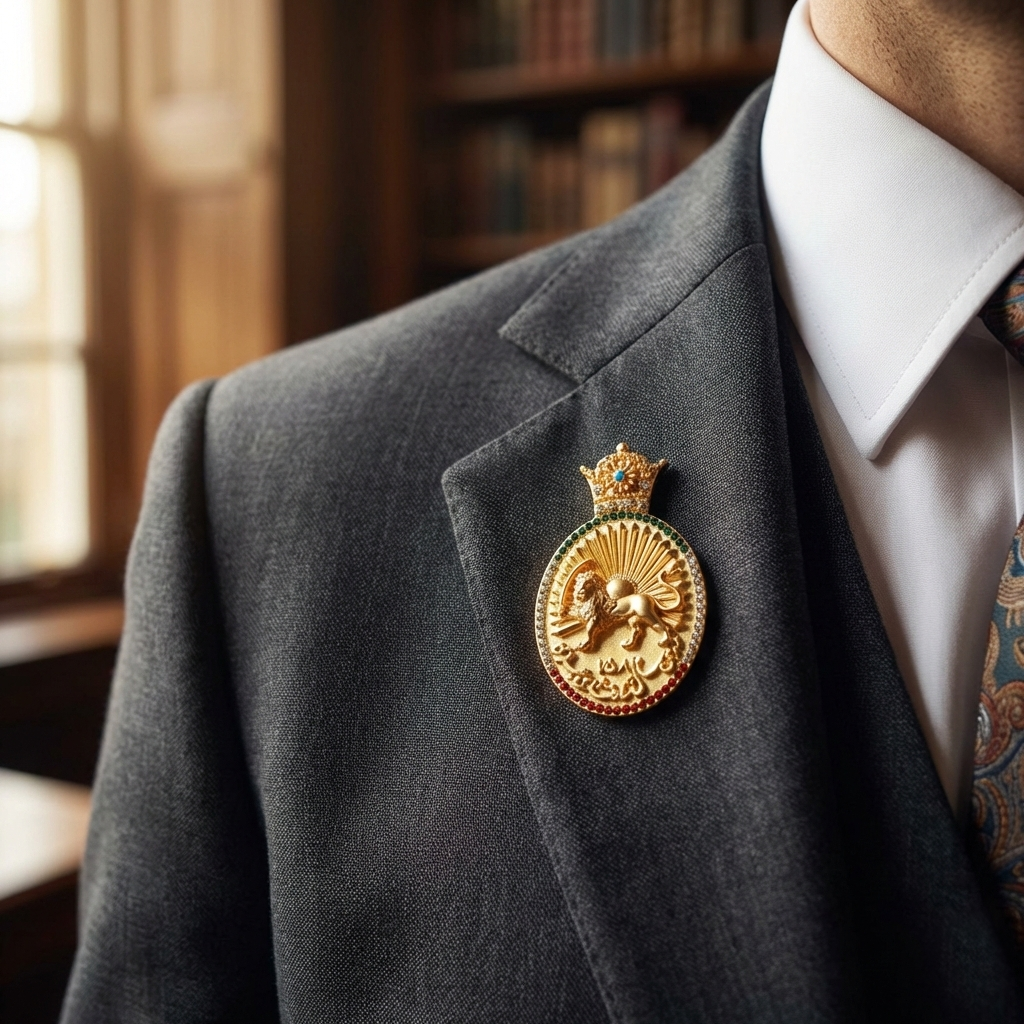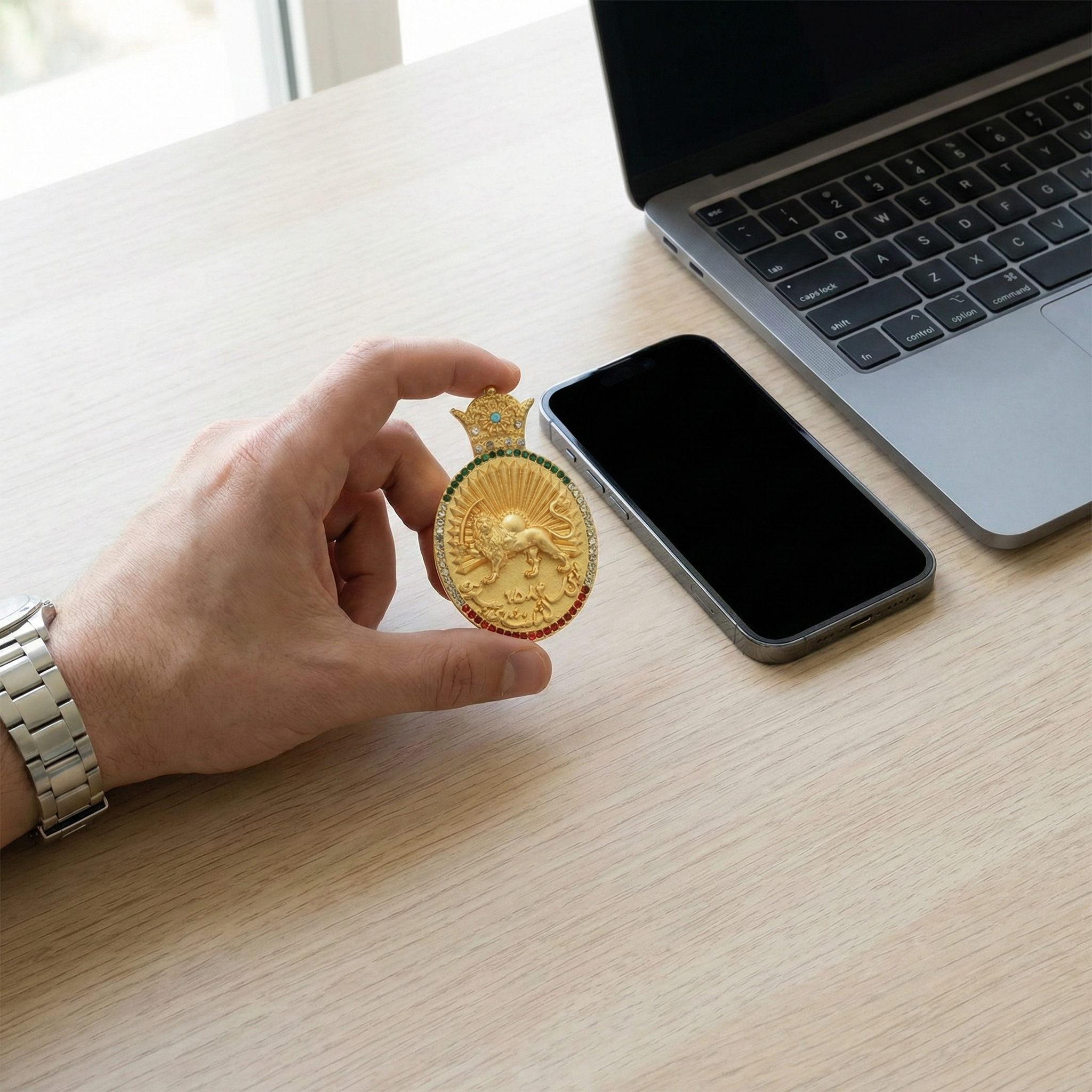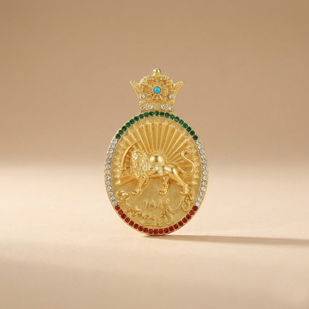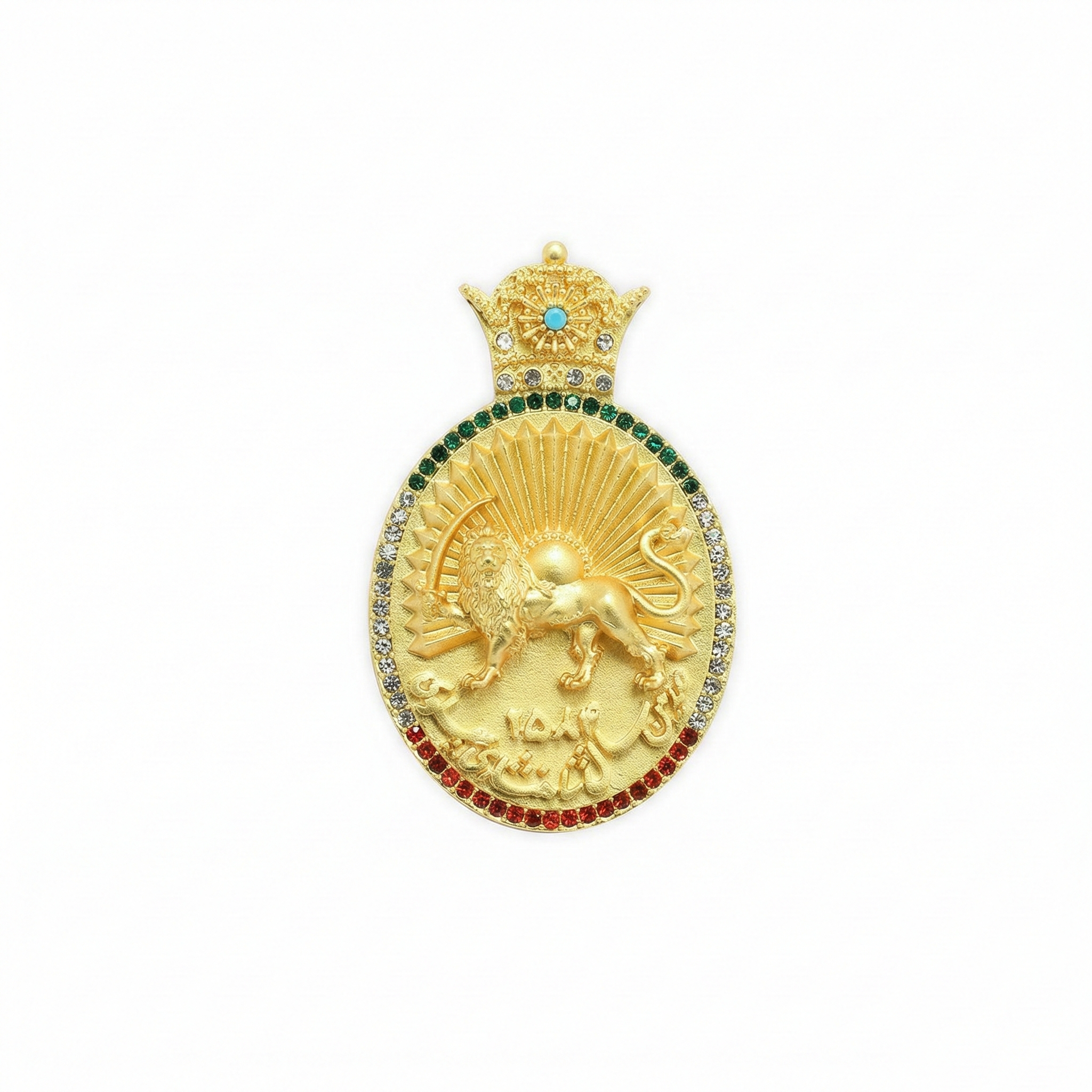 این مدال پین لوکس، بازآفرینی مدرن یکی از نمادهای تاریخی ملی است. طراحی آن با الهام از نشان شیر و خورشید انجام شده و با جزئیات برجسته، بافت فلزی دقیق و سنگکاری تزئینی جلوهای فاخر و متمایز ایجاد کرده است.