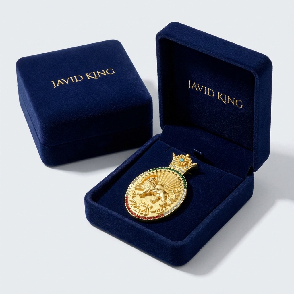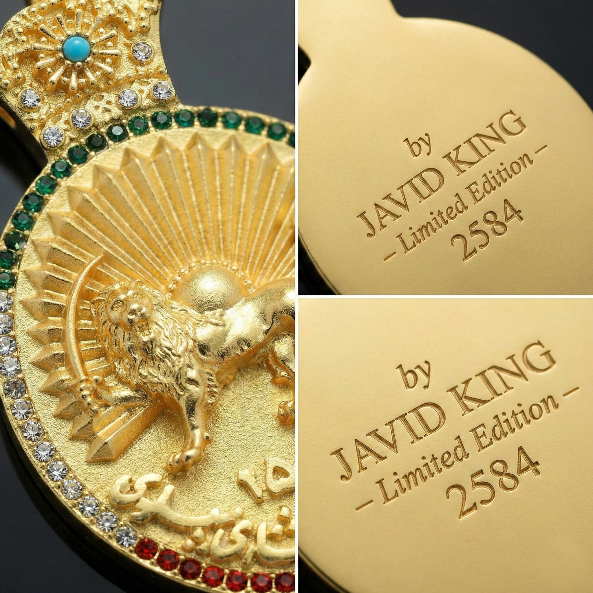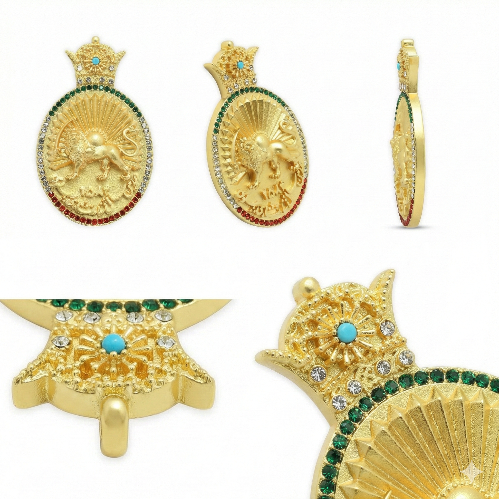 مدال پین لوکس با الهام از نشان تاریخی شیر و خورشید، ساختهشده با روکش طلایی براق و تزئینشده با نگینهای سبز، سفید و قرمز. طراحی خاص نسخه Limited Edition برند Javid King، مناسب استایل رسمی، کلکسیون و هدیهای ارزشمند.